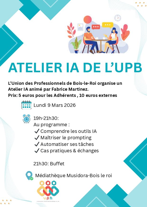 Le lundi 9 mars, l'UPB a le plaisir de vous inviter à son tout premier atelier consacré au thème fascinant de l'IA. C'est une belle occasion pour nos membres, mais aussi pour tous ceux qui s'intéressent à ce sujet passionnant, de se rassembler et d'échanger des idées. N'oubliez pas, les places sont limitées, alors ne tardez pas !